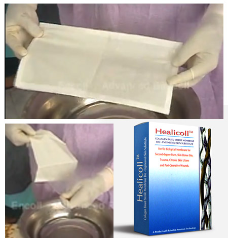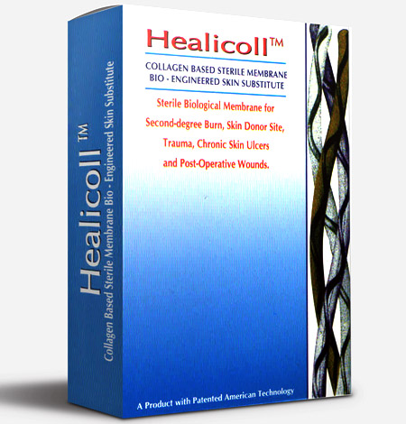 Healicoll is a Bio - Engineered high purity Type-I collagen (>97% pure) forming an acellular skin substitute construct that is highly bioactive, cell conductive, and supportive towards enhancing tissue generation for wound management. Healicoll is an acellular dermal replacement product and is within the definition of a bioengineered skin substitute. It provides a framework that promotes the regeneration of blood vessels and supports biologic cell migration due to the resorbable properties of Healicoll. Treatment course typically involves 1 to 4 applications.It is processed under GMP conditions and with stringent USP qulality tests as per WHO other International Standards.