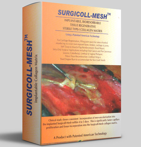 Surgicoll-Mesh is Bio-compatible and sterilized Type-1 collogen matrix for soft tissue & muscle flap reinforcement, Dural repair, Colorectal, urethral & vaginal Prolapse, pelvic floor reconstruction , urethral sling & Third Degree Burn to accommodate the skin graft needs,knee replacement surgery & other orthopaedic procedures